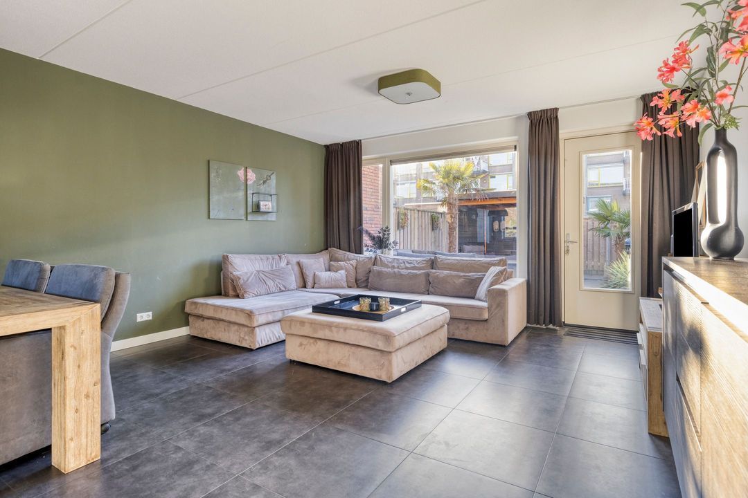Uitgebouwde tuingerichte woonkamer met trapkast, de vloer is afgewerkt met een moderne tegelvloer v.v. vloerverwarming.
